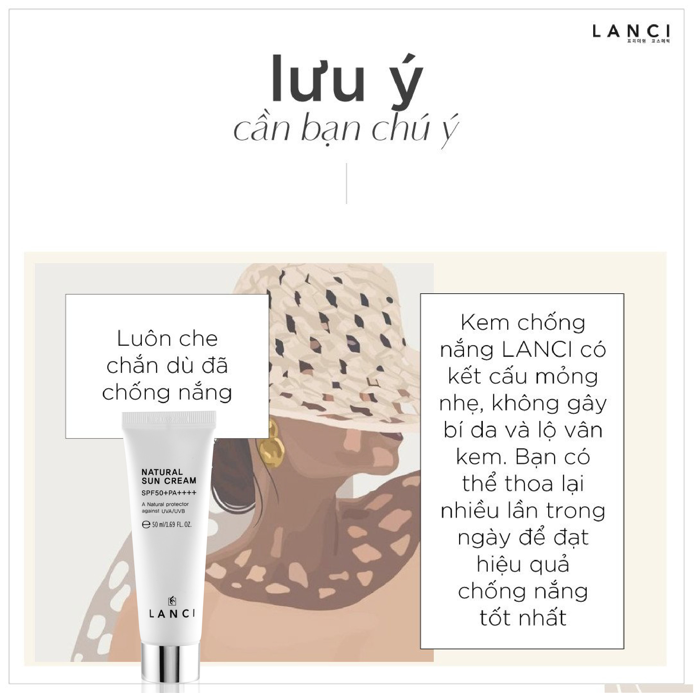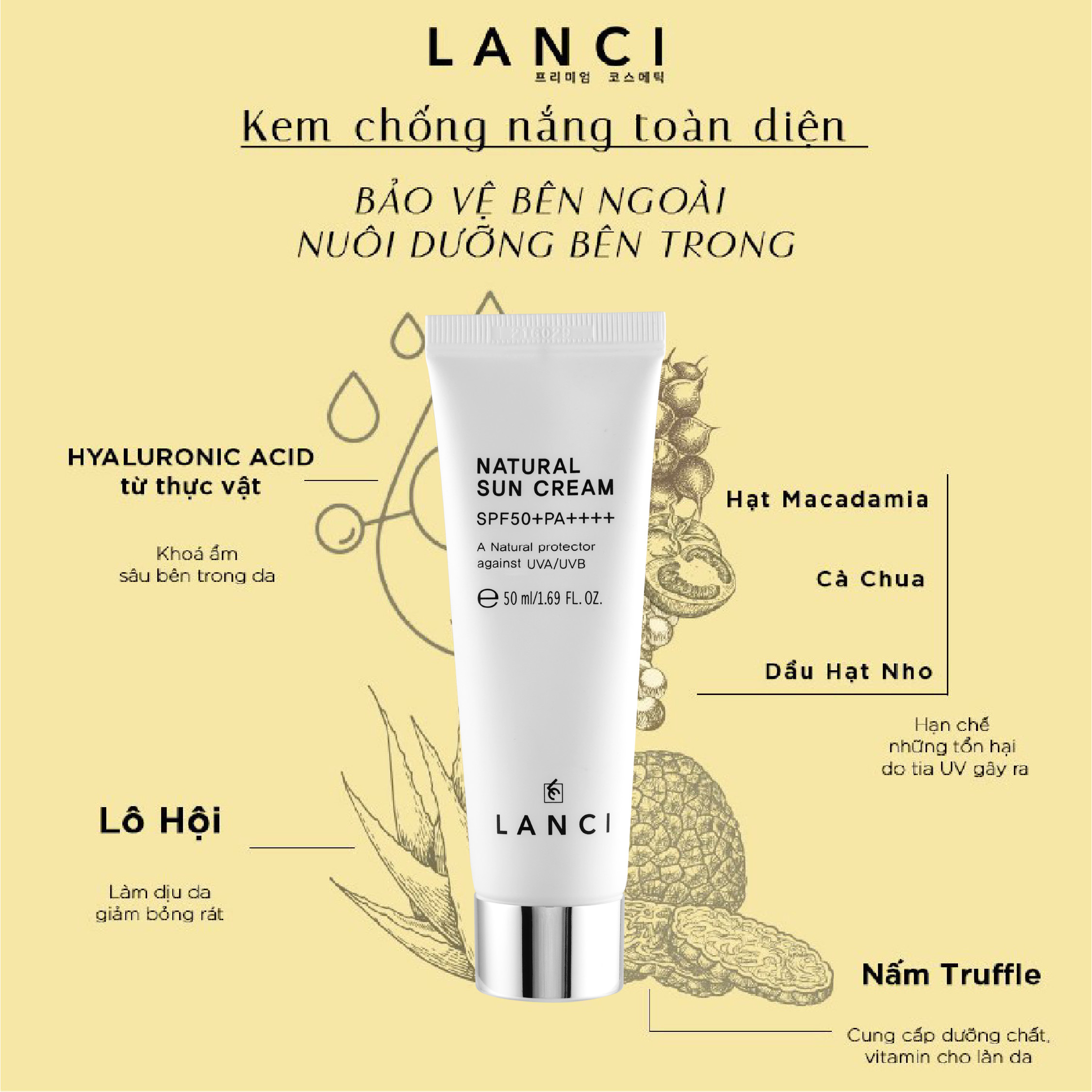 Kem Chống Nắng Lanci Natural Sun Cream SPF50+ PA++++ Hàn Quốc là một trong những dòng được yêu thích nhất tại Hàn Quốc vì nó hoàn toàn thấm nhanh, không nhờn, mà lại có khả năng bảo vệ và dưỡng da cực tốt.