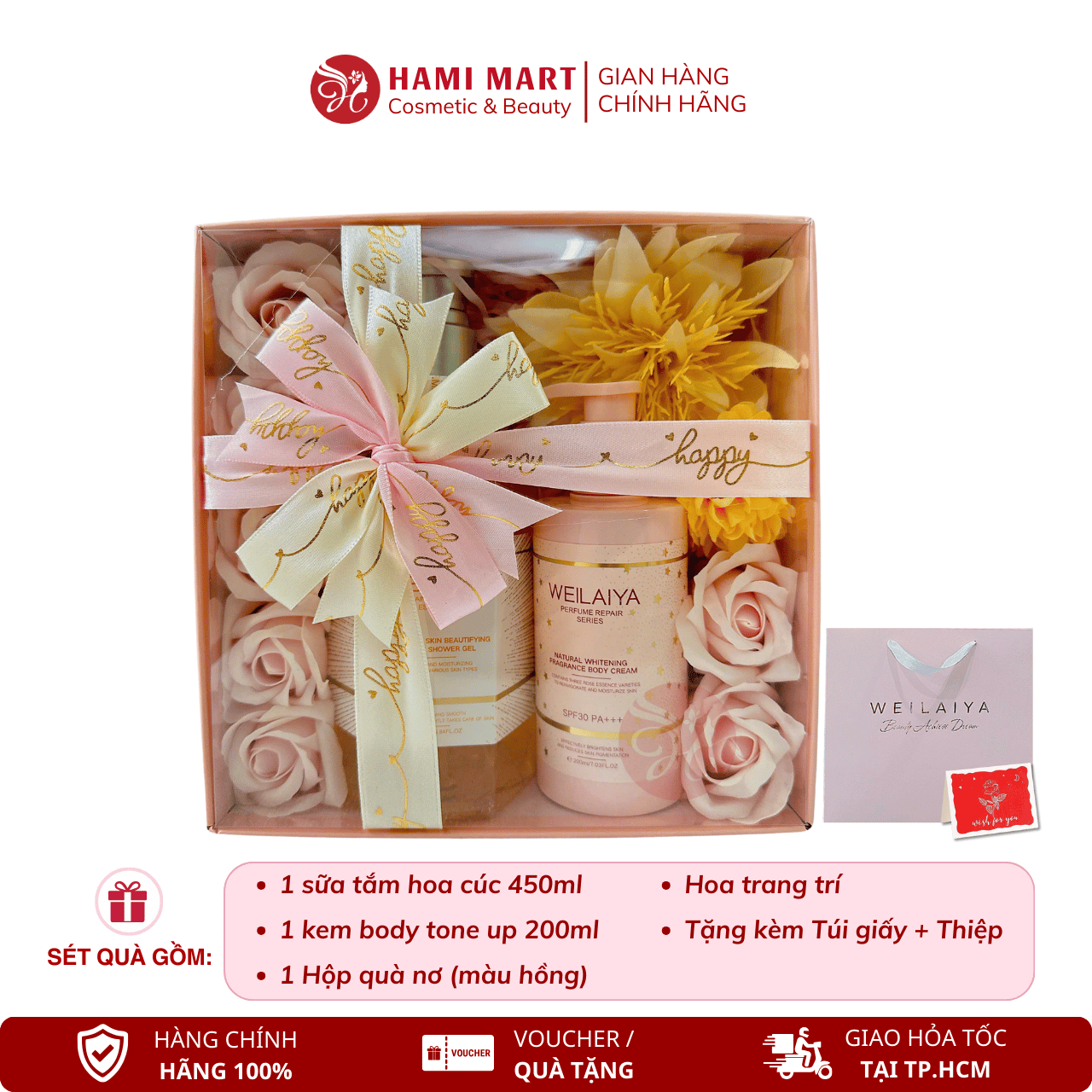[Hộp hồng] Sét Quà Sữa Tắm Hoa Cúc Weilaiya + Kem Body Tone Up Weilaiya