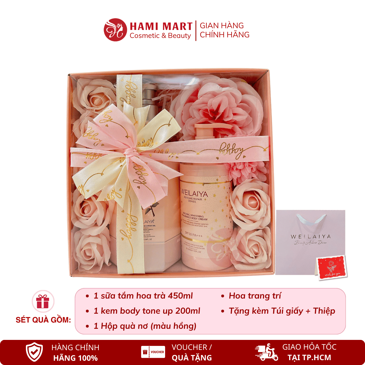 [Hộp hồng] Sét Quà Sữa Tắm Hoa Trà Weilaiya + Kem Body Tone Up Weilaiya